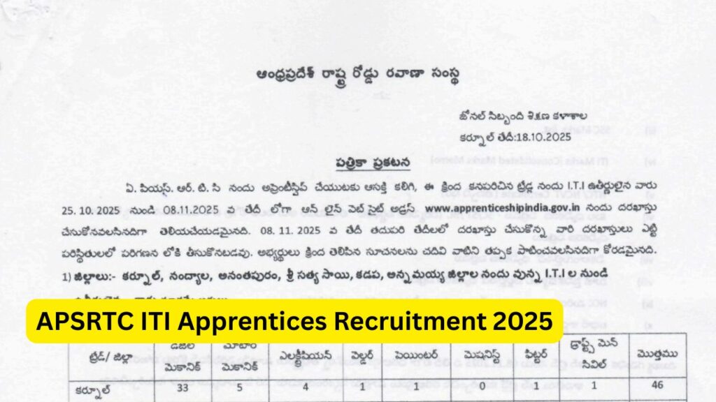 APSRTC ITI Apprentices Recruitment 2025: आंध्र प्रदेश राज्य सड़क परिवहन निगम (APSRTC) ने 2025 के लिए ITI अप्रेंटिस के 277 पदों पर भर्ती का नोटिफिकेशन जारी किया है। यह भर्ती उन युवाओं के लिए एक सुनहरा अवसर है जिन्होंने ITI (Industrial Training Institute) में प्रशिक्षण प्राप्त किया है और सरकारी क्षेत्र में करियर बनाने की इच्छा रखते हैं। इस भर्ती के माध्यम से APSRTC विभिन्न जिलों में अप्रेंटिस के रूप में प्रशिक्षु नियुक्त करेगा, जिससे युवाओं को व्यावसायिक प्रशिक्षण और अनुभव प्राप्त होगा।