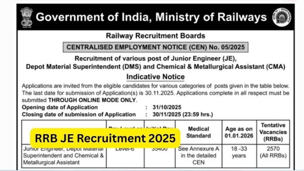 RRB JE Recruitment 2025: 2025 में Railway Recruitment Board (RRB) द्वारा आयोजित होने वाली जूनियर इंजीनियर (JE) भर्ती में कुल 2,570 पदों के लिए जानकारी प्रकाशित की गई है। इस भर्ती के तहत विभिन्न इंजीनियरिंग श्रेणियों में डिप्लोमा या डिग्री धारक उम्मीदवार आवेदन कर सकते हैं। भर्ती प्रक्रिया पूरी तरह से ऑनलाइन होगी और इसके द्वारा रेलवे में तकनीकी एवं रखरखाव सम्बन्धी कार्यों में शामिल होने का अवसर मिलेगा।